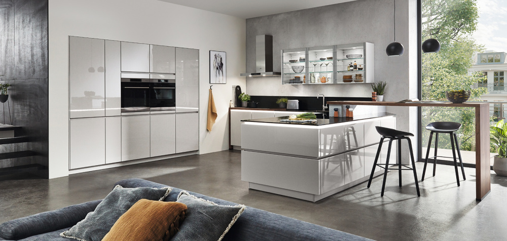 Пуристический дизайн эффектную выделяется сочетанием материалов из кварцевого камня, натурального лака и стекла. Современный стеклянный навесной шкаф с фасадом из стеклянных ламелей приобретает на кухне совершенно новое измерение, по-настоящему привлекая внимание благодаря целенаправленным световым эффектам. Выборочно в механическом или электронном исполнениях. Ручки-планки шелково-серого цвета с подсветкой создают сдержанный акцент и обеспечивают впечатляющую атмосферу.